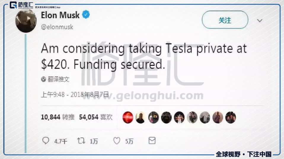 一个月前,特斯拉传来私有化的消息,马斯克称正在考虑私有化特斯拉,并且已经有资金保障了。马斯克一直苦于上市后做空机制、股价的剧烈波动和分析师的狂轰滥炸,想要退市脱离苦海。