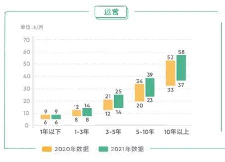 根据拉勾今年发布的《2021互联网人才招聘白皮书 》,2021年,1年以下的运营岗平均薪酬在9k左右,工作1-2年后,薪酬可以达到14k。而10年以上的运营人平均薪酬可以达到58k。