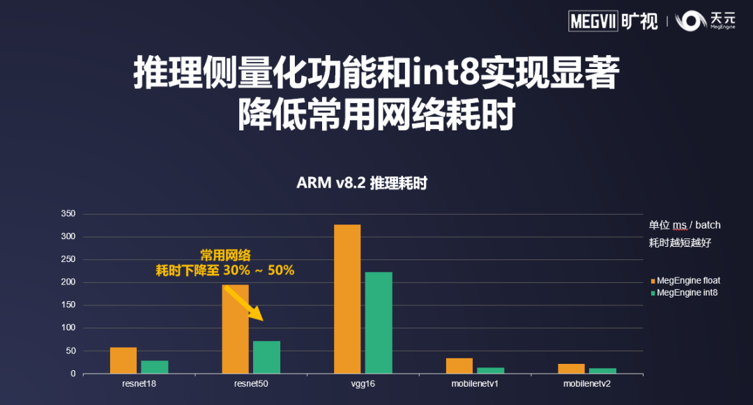 以上表格中,在各类模型上,通过应用量化感知训练,可以在极小的精度下降前提下,使用 int8 推理。量化感知训练产生的高精度模型,配合上天元经过高度优化的 int8 算子,可以将各个常见网络的推理耗时降至浮点模型的 30%~50% 以内,有效带来性能加速。