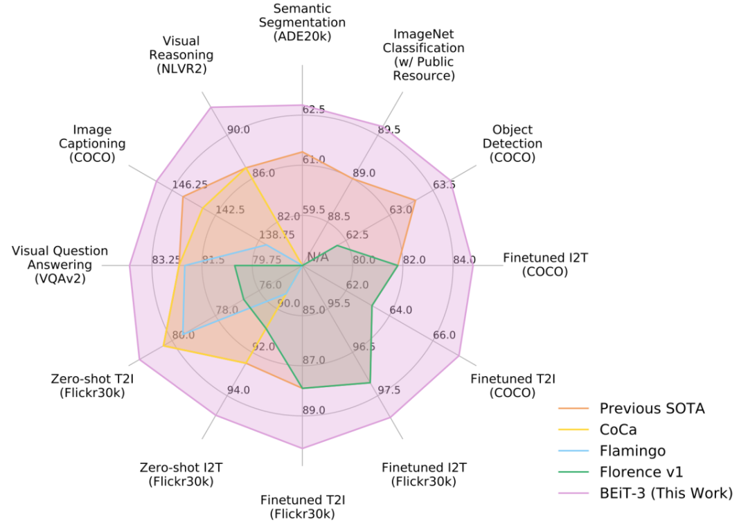与其他特定模型或基础模型相比,BEiT-3 在广泛任务中实现了最佳性能