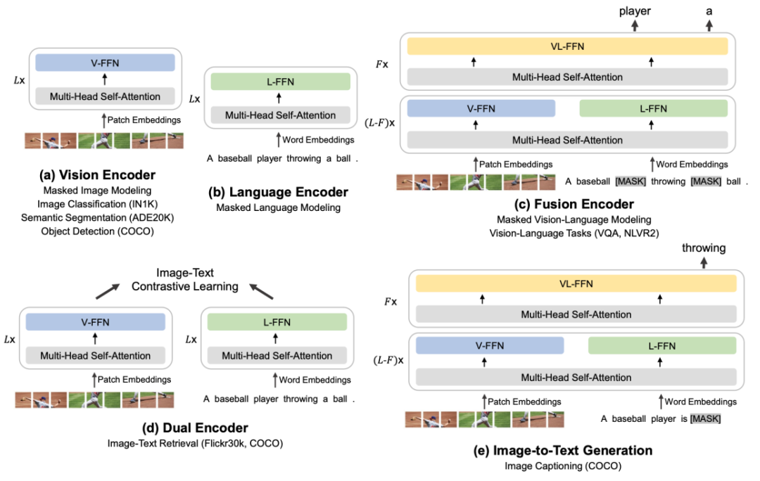 首先,研究人员使用 Multiway Transformer 作为骨干模型来编码不同的模态。每一个 Multiway Transformer 模块都由一个共享的自注意力模块和一组用于不同模态的前馈网络池(即模态专家)组成,从而可以同时编码多种模态。