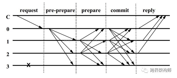 「commit」:每个师长收到2f个师长(军长不做prepare)的“收到”请求后发送“随时开干”给军长和其他两个师长。(f为可容忍的拜占庭节点数)