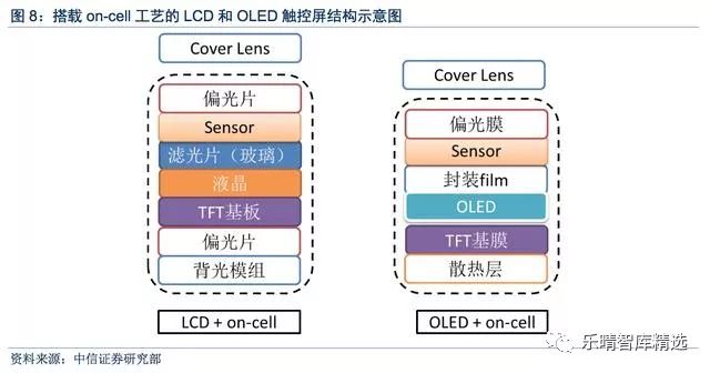 OLED触控显示屏(外挂为例)相对于LCD减少一层偏光片,同时也不需要背光模组。