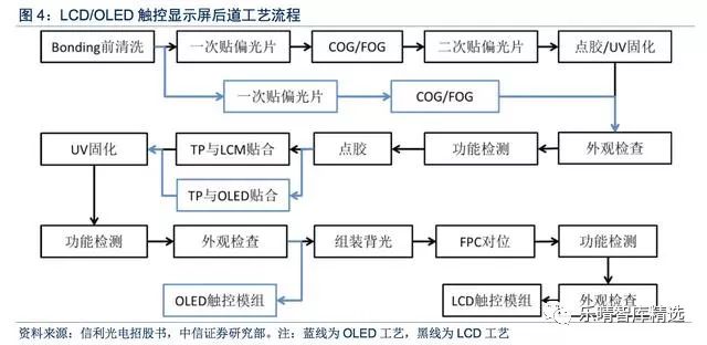LCD和OLED后道工艺流程相似,后者减少背光模组以及偏光片组装。后道工艺主要针对的是触控显示屏的模组工序,可以分为bonding、点胶、贴合、检测四大类。