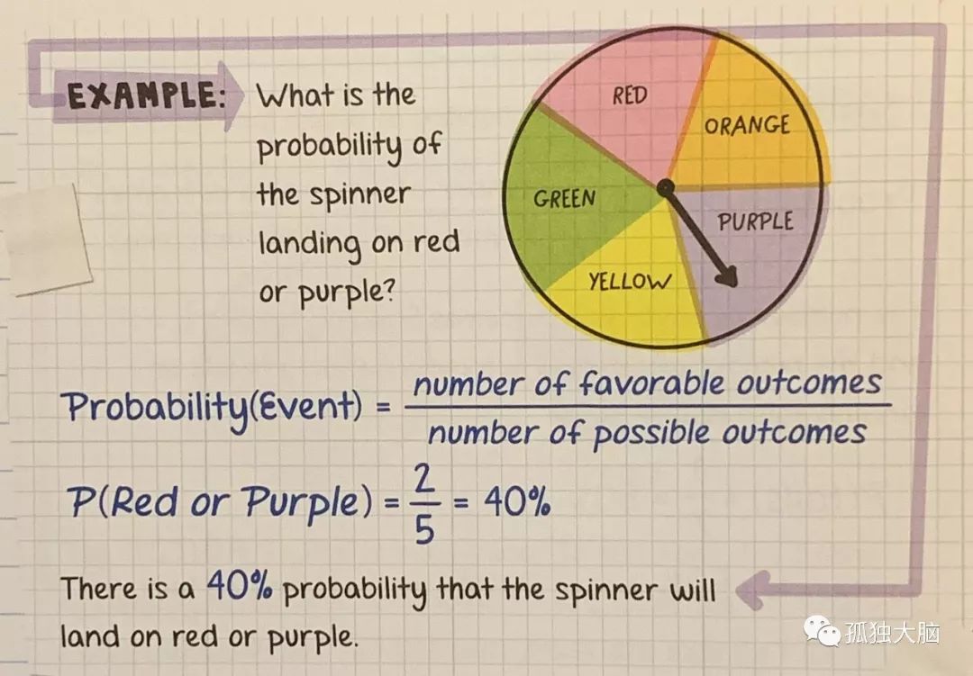 在上图中,落在红色上的概率是1/5,落在紫色上的概率是1/5,所以落在红色或者紫色上的概率就是2/5。