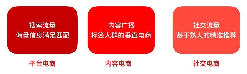 从人与货品交互的平台电商、人与内容关联的内容(社区)电商,到人与人之间基于信任的社交电商,其背景是流量越来越贵。不仅如此,流量的流向也在发生变化,平台时代靠工具搜索,内容时代靠情感广播,社交时代则是熟人之间的互动。