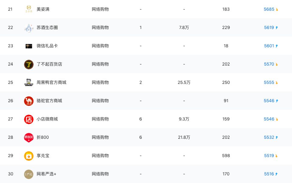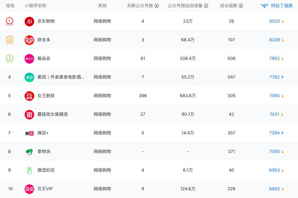 根据阿拉丁指数,在购物标签是一共有93747个小程序样本,排名在前三十的小程序中,近一半是大平台或大品牌的应用小程序,主要目的是渠道补充,商业模式也是基于搜索的货架电商模式,比如小米、京东购物、唯品会、蘑菇街、苏宁、周黑鸭等。
