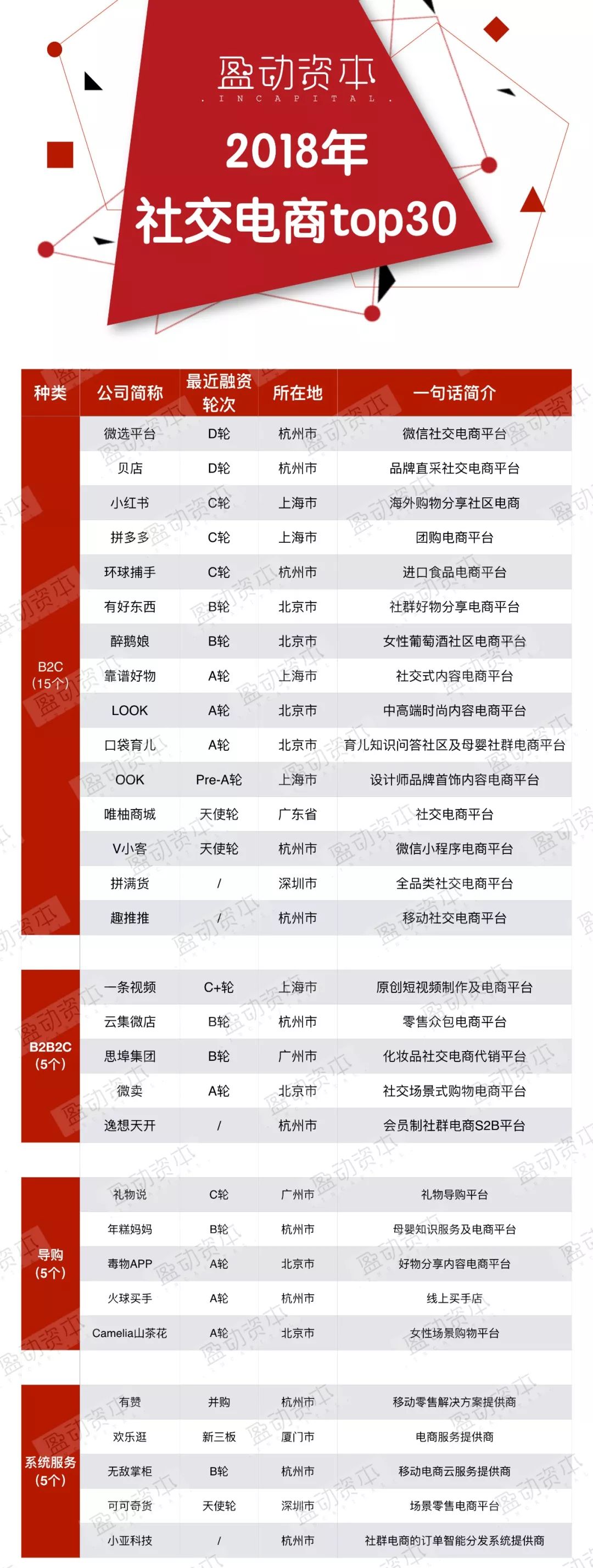 根据图3所示,从轮次上来看,天使轮项目进有3个,B轮之后的项目有15个占一半之多,其中5个均为大平台转型或扩展的产品。这也从数据上说明,社交电商准入门槛略高,并且第一轮的创新已经进入中场,而新的创新还在酝酿。这对投资来说是个好信号。