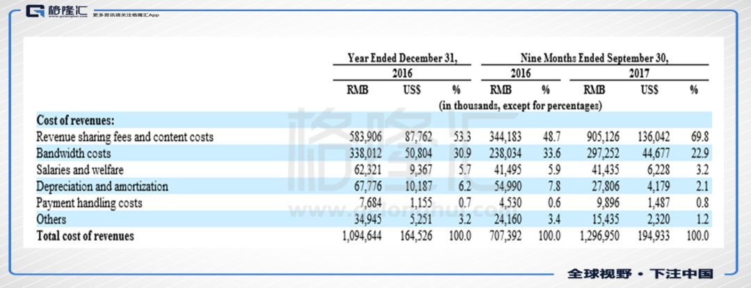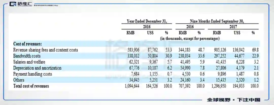 我们从招股说明书中,看公司的财务明细,可以看到,主要的成本构成是Revenue sharing fees and content costs,什么意思?礼物分享费和内容成本。