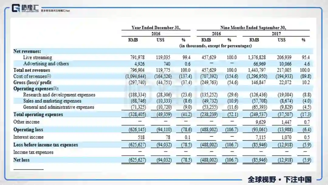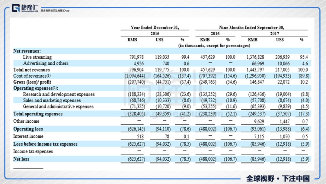 而我们看直播收入,2016年直播收入为791,978千元人民币,而礼物分享费和内容成本的合计是583,906千元人民币,提成率为73.73%。2017年前三季度直播收入1,376,828千元人民币,礼物分享费和内容成本为905,126千元人民币,提成率为65.73%。单从这个比率我们就明显下降,说明公司已经在提高收入水平。