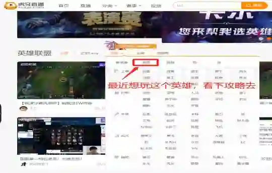 这是主分类,再看虎牙的细分类。比如英雄联盟,大多直播平台都没有每个主播主玩的英雄分类,而虎牙把每个主播的细分类都细分的清清楚楚。这是一个平台对客户的真诚。