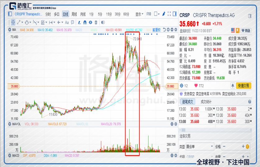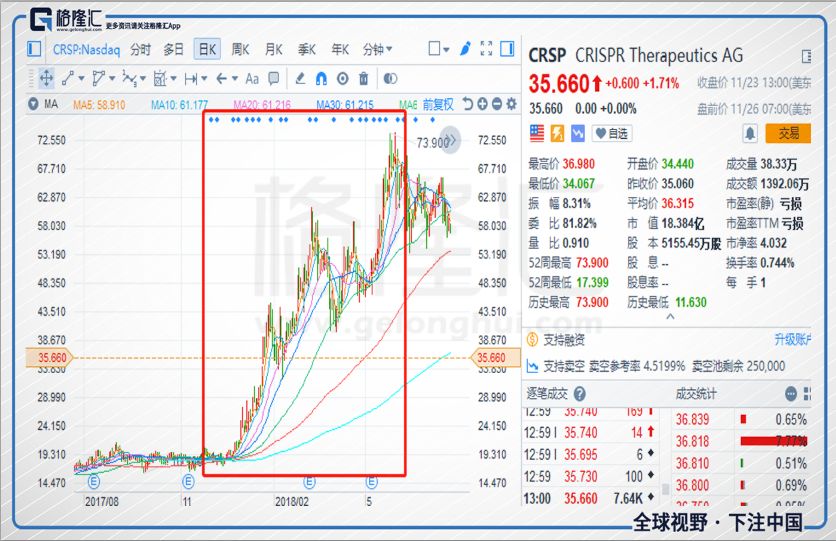 直接以CRISPR疗法命名CRISPR Therapeutics(CRSP)公司也乘着风迎来了狂欢。