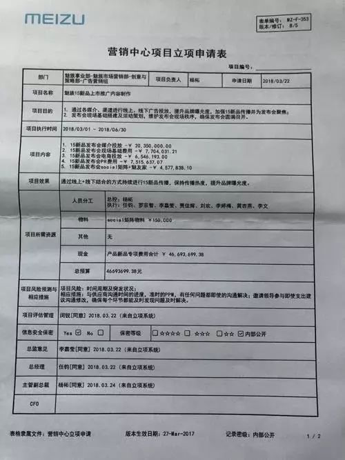从具体项目内容预算叠加可以看出,此次杨柘为名为“魅族15新品上市推广内容制作”的项目,共申请了总计46693699元的资金,以求达到“通过线上+线下结合方式,持续进行15新品传播,保持传播热度,提升品牌曝光度”的目的。