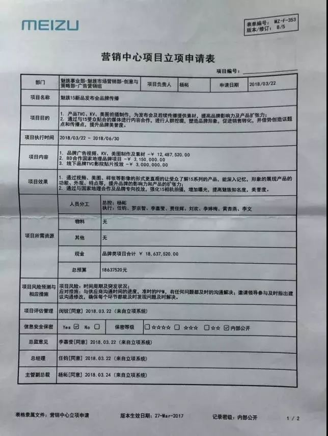 另有名为“魅族15新品发布会品牌传播”的项目,需要申请总计18637520元的预算,以期达到“提高魅族知名度、美誉度”的目的。两者相加共计65331219元。