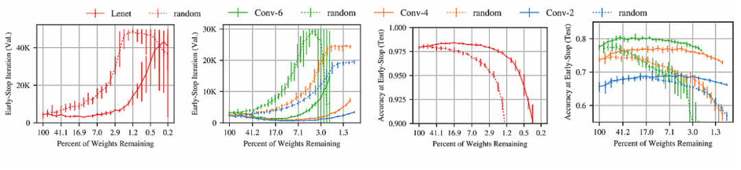 」,作者用 Lenet、Conv-2、Conv-4、Conv-6 结构验证了「中奖彩票」(图 2 实线)的优势。横轴代表网络的稀疏性 Pm,例如 Pm=25 时 75% 的权值被修剪。中奖票可以较快进行训练,并达到与原网络相似的精度。