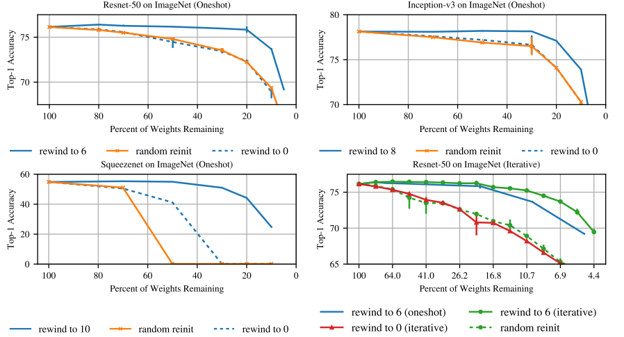 在这些大数据集支撑的更深层次的网络上的实验,IMP 没有任何证据支持 Frankle 和 Carbin 在「彩票假说」里的假设:rewind to 0 比随机初始化(reinit)时能找到能力更好的子网络。但是,rewinding 在训练开始的几代内,可以找到具有这些优良性能的子网络。