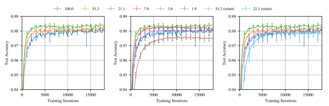 作者在全连接网络 Lenet 上用 MNIST 数据集按迭代剪枝的方法进行训练,结果见图 4,绘制了训练中奖彩票迭代修剪到不同程度时的平均测试精度,label 为不同修剪程度。当 Pm>21.1 时,网络越修剪,学习速度变快(左图)。当 Pm<21.1 学习速度减慢(中图),当 Pm=3.6% 时,中奖彩票会回到原来网络相似的表现。大部分中奖票的准确率明显高于原始网络,这意味着中奖彩票的训练精度和测试精度之间的差距较小,泛化能力有所提高。