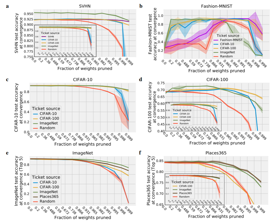 而且在更大、更复杂数据集上生成的中奖票性能远远优于小数据集。例如在 ImageNet 和 Places365 数据集上生成的中奖票应用于其他数据集上时,都具有更强的竞争力。当大网络非常过度参数化地处理小数据集时,比如将 VGG19 应用于 Fashion-MNIST 时,发现转移中奖票的性能明显优于在 Fashion-MNIST 本身产生的中奖票,这也为我们提供了另一种处理网络过拟合的方法。