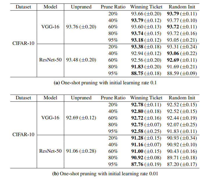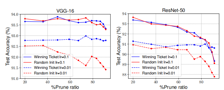 中奖票只在非结构化剪枝下、初始学习率较小时有效,其余时候不如随机初始化的性能好