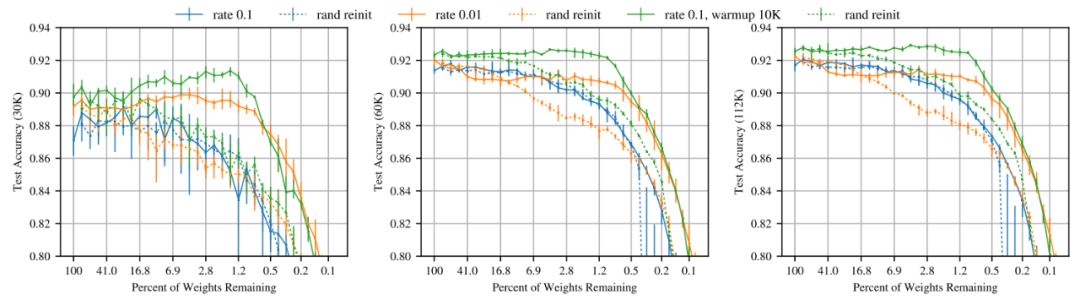 不过从实验结果(图 6)发现,在较高的学习率下,迭代剪枝找不到中奖票,并且性能比剪枝网络随机初始化时更差。但在较低的学习率时,可以得出与之前相同的结论:在 Pm≥3.5 时,子网络比原网络的精度始终高 1%。如果随机重新初始化(rand reinit),子网络又会失去准确性。