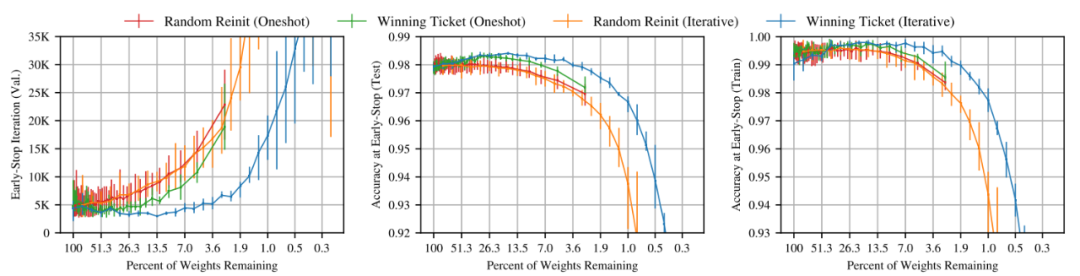 当与原始网络的精度相匹配时,迭代剪枝可以提取到较小的获胜票