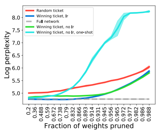 首先,在 Wikitext-2 数据集上对 LSTM 模型的实验中发现,在所有修剪程度上,有 last rewind(即 lr)的中奖票性能明显优于随机票(图 12)。有趣的是,去除 lr(绿色线)对模型性能只有轻微的损坏。这表明对于 LSTM 语言模型来说,lr 方法不太重要。但是迭代修剪是必不可少的,比如使用一次修剪方法(one-shot)时,一旦 80% 的参数被修剪模型性能会急剧下降。这些结果共同验证了中奖彩票在 LSTM 语言模型的有效性。