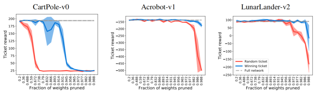 另外在强化学习的应用中,作者在经典控制中选择了三个游戏:Cartpole-v0、Acrobot-v1 和 Lunar Lander-v2,并使用了一个简单三隐层的全连接模型。结论则与图像分类的结果一致(图 13),几乎在所有剪枝程度上,中奖票的得分都超过随机初始化的网络。