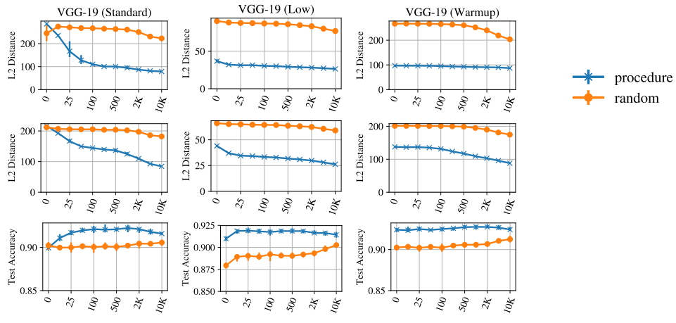 图 10 中,在 VGG19 网络上对 rewinding 对剪枝网络稳定性影响的实验中,横轴为 rewinding 重设迭代的次数,procedure 为「彩票假说」中寻找中奖票的迭代剪枝(IMP)方法,random 则为随机剪枝方法。第一行为 data order 距离,第二行为 pruning 距离。而 L2 距离是衡量稳定方法的一种,距离越小,网络越稳定,性能越好。随着 rewinding 次数增加,L2 距离大多减小,IMP 子网络的稳定性与重设为 0 次迭代时的稳定性相比有了很大的提高。从第三行的实验中,也可证明 IMP 发现的中奖票比随机子网络表现出更高的准确性。