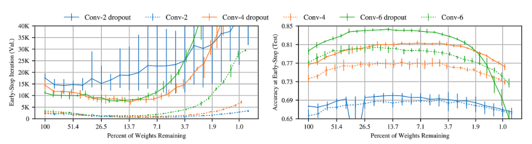 之后,作者还用 Cifar-10 数据集在卷积网络上进行了相同的实验,得到了与前面相同的结论。随着网络的修剪,中奖彩票与原始网络相比,学习速度更快,测试精度更高,泛化能力更强。同时证明了 Dropout——2012 年 Hinton 等人【3】提出通过随机禁用每次训练中的一小部分(即随机采样一个子网络)来提高测试精度——在中奖票的训练中同样适用。从图 5 中看出,