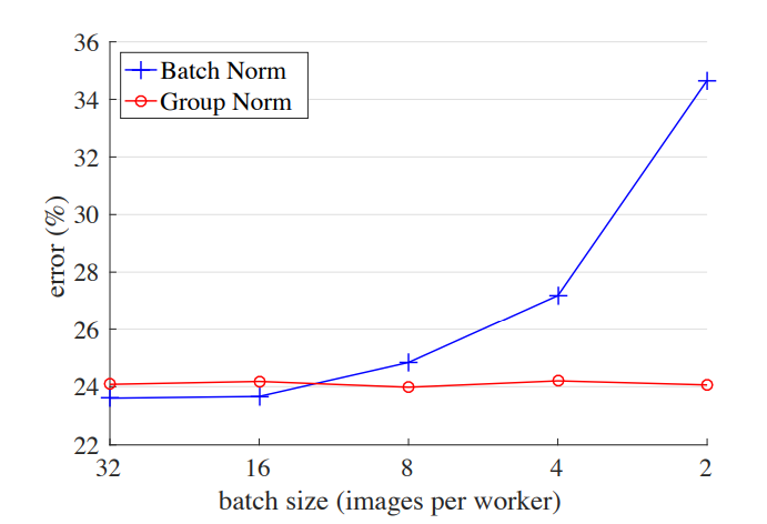 这些方法处理方式和BN类似,但是归一化的维度不一样,BN是在(N, H, W)维度上,LN是在(H,W,C)维度上,IN是在(H,W)维度上,GN更巧妙,其通过对C分组,此时特征可以从[N, H, W, C]变成[N, H, W, G, C/G],GN的计算是在[H, W, G]维度上。LN,IN以及GN都没有在B维度上进行归一化,所以不会有BN的问题。相比之下,GN是更常用的,GN和BN的效果对比如图2所示: