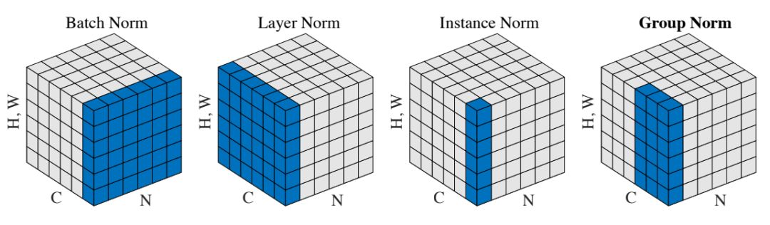 解决BN上述问题的另外一个方向是避免在batch维度进行归一化,这样当然就不会带来训练和测试的不一致性问题。这些方法包括Layer Normalization (LN),Instance Normalization (IN)以及最新的Group Normalization(GN),这些方法与BN的区别可以从图1中看出来: