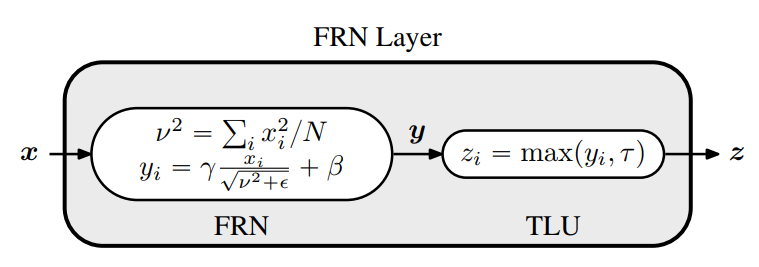 def FRNLayer(x, tau, beta, gamma, eps=1e-6):# x: Input tensor of shape [BxHxWxC].# alpha, beta, gamma: Variables of shape [1, 1, 1, C].# eps: A scalar constant or learnable variable.# Compute the mean norm of activations per channel.nu2 = tf.reduce_mean(tf.square(x), axis=[1, 2],keepdims=True)# Perform FRN.x = x * tf.rsqrt(nu2 + tf.abs(eps))# Return after applying the Offset-ReLU non-linearity.return tf.maximum(gamma * x + beta, tau)