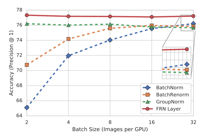可以看到FRN是不受batch size的影响,而且效果是超越BN的。论文中还有更多的对比试验证明FRN的优越性。