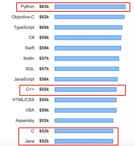 据报告显示:今年Python增长速度仍是最快,在今年的编程语言排行榜上力压 Java,位居第二受喜爱的语言(仅次于 Rust),随之带来的,就是薪酬的提升:
