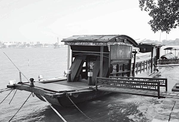 中国“一大”会址之一的浙江嘉兴南湖画舫的仿制品,停在南湖上供游人参观。
