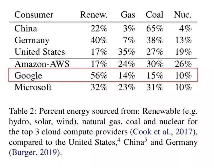 如何做环境友好的人工智能研究,更多的使用清洁能源或是出路。从下面的表中我们可以看出,Google的数据中心用电56%来自可再生能源。
