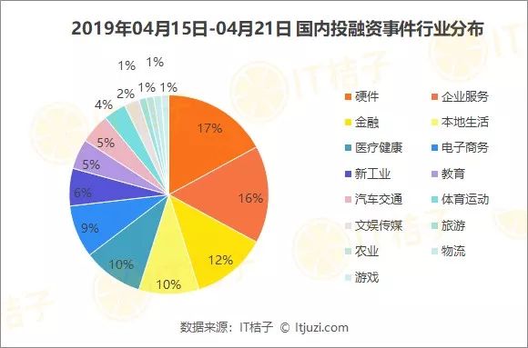 从行业分布来看,硬件行业成为上周发生投融资事件最多的行业,出现 14 起,占比17%;其次,企业服务行业位列第二,发生 13 起投融资事件,占比 16%;金融行业位列第三,发生 10 起投融资并购事件,占比 12%。