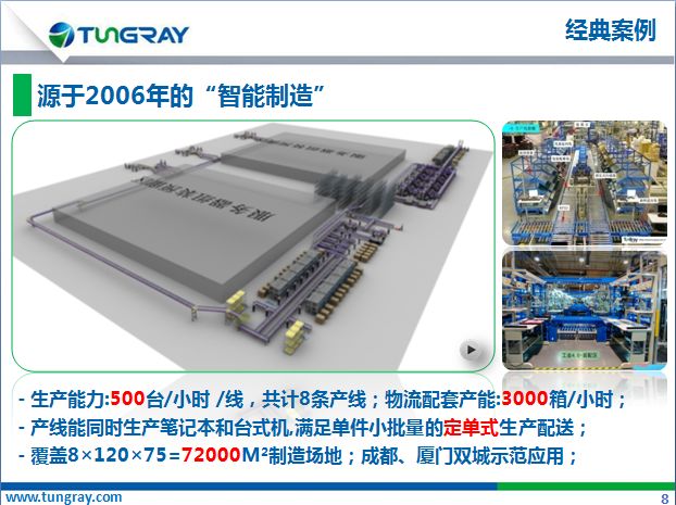 该项目为2006年戴尔智能工厂项目,是真正意义的智能工厂。戴尔精益生产和智能工厂结合的非常好。产线由昆山同日实施。电脑硬盘的拆除以前用人工拆非常麻烦,现在采用自动的方式拆,包括组装过程,都是有RFID,包括现场自动贴标,以及产品老化过程当中的转运,基本上尽量做到了全自动。对于戴尔的智能工厂,设备不是最先进的,但是理念是非常好的,到现在为止仍然是笔记本或者说电脑行业全球最先进的生产技术。
