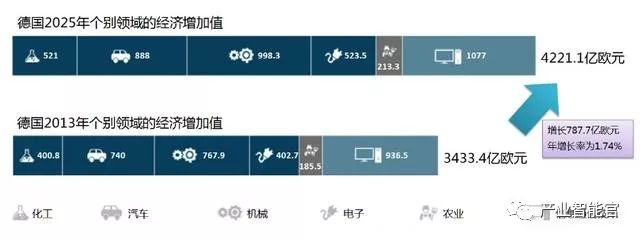 德国信息产业、电信和新媒体协会(BITKOM)对德国“工业4.0”的经济效益进行了预测。BITKOM的预测数据显示,相对于2013年,德国经济增加值将保持1.74%的年增长率,到2025年有望高达787.7亿欧元。