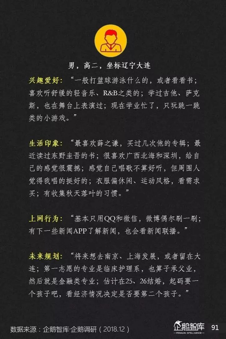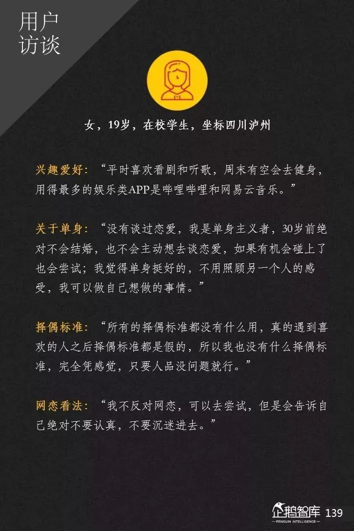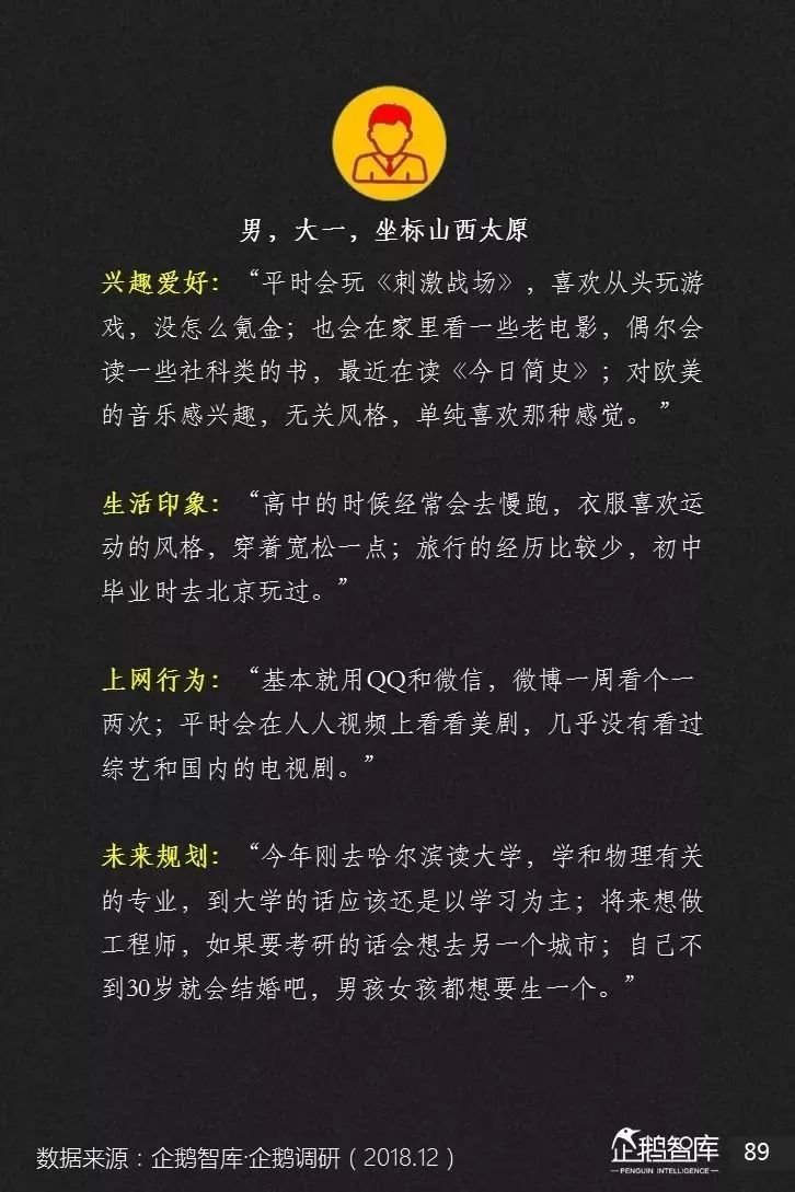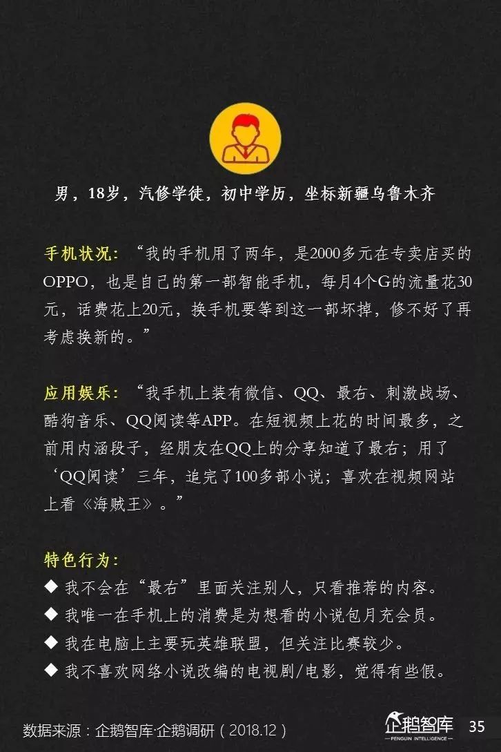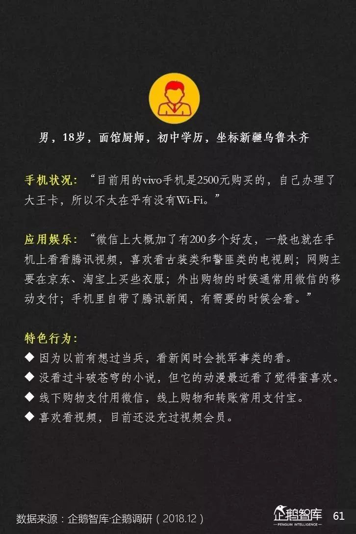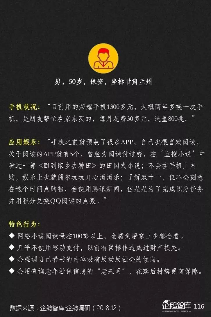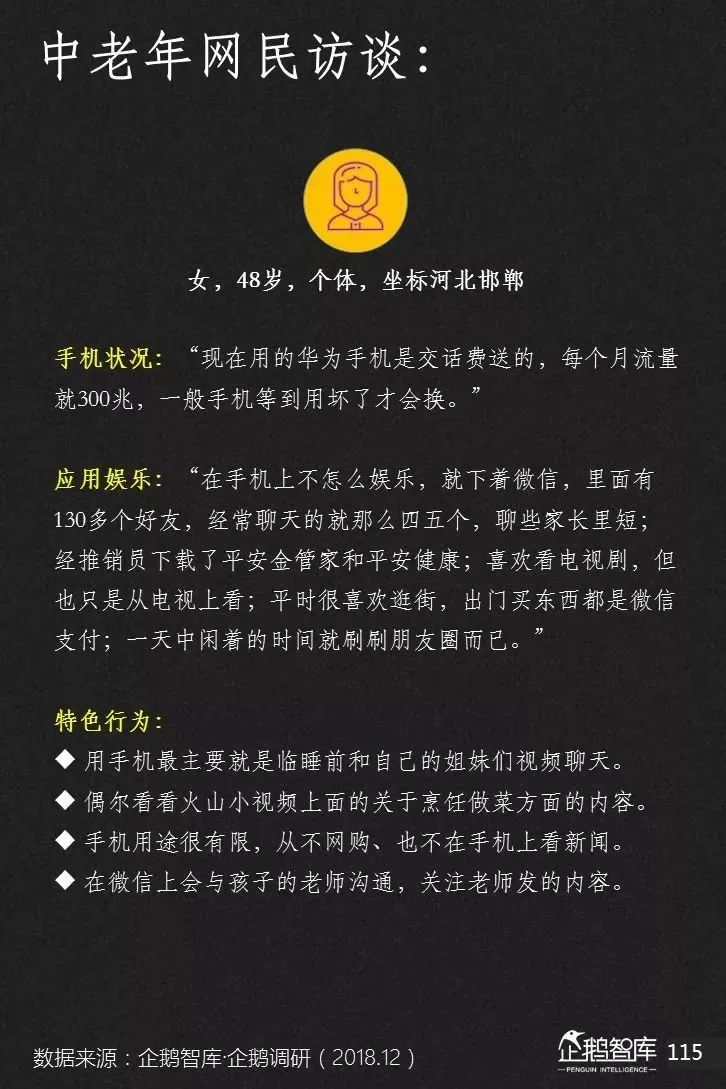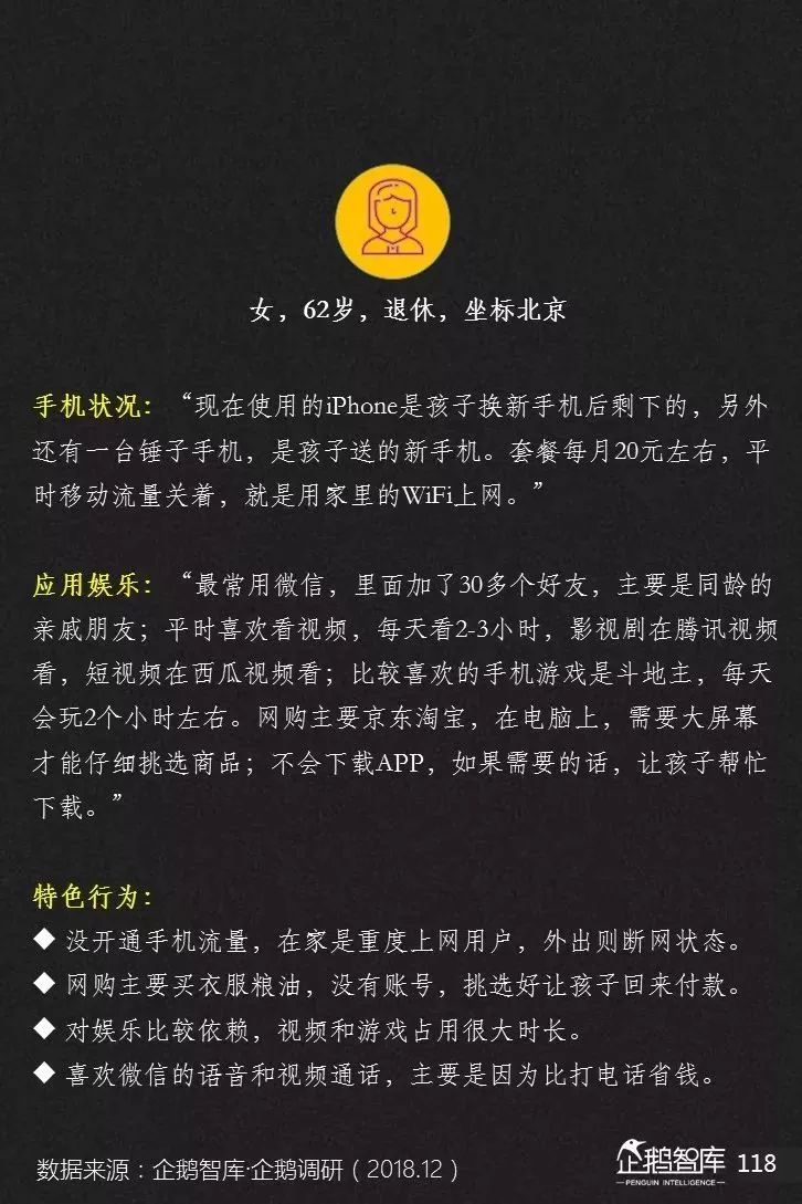 他们的智能手机上,平均安装的APP更少,可消费的碎片化和整段休闲时间更长,对单一产品的沉浸度相对也更高——这些是我们通过互联网的数据,可以感知到的一些特性。