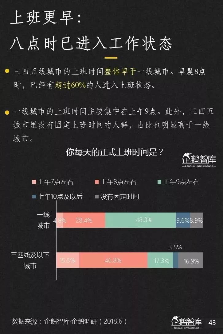 对三四五线城市的网民来说,他们平均上班时间,比一线城市要早一个小时。但他们实际上,在上班路上消耗的时间要比一线城市少很多。