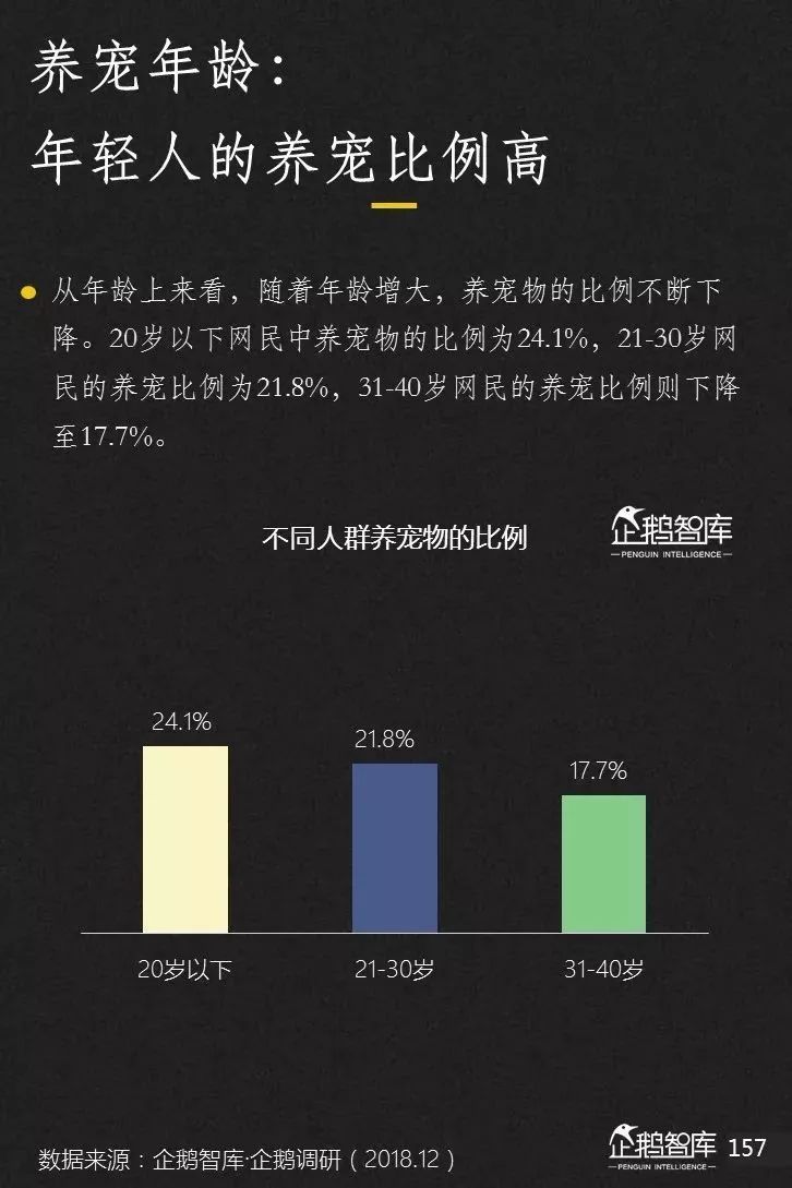 我们看到年轻人在养宠热情上已经超过成年人,随着互联网上宠物文化的进一步流行,未来,整个中国城镇网民中,养宠的比例有望进一步增长。