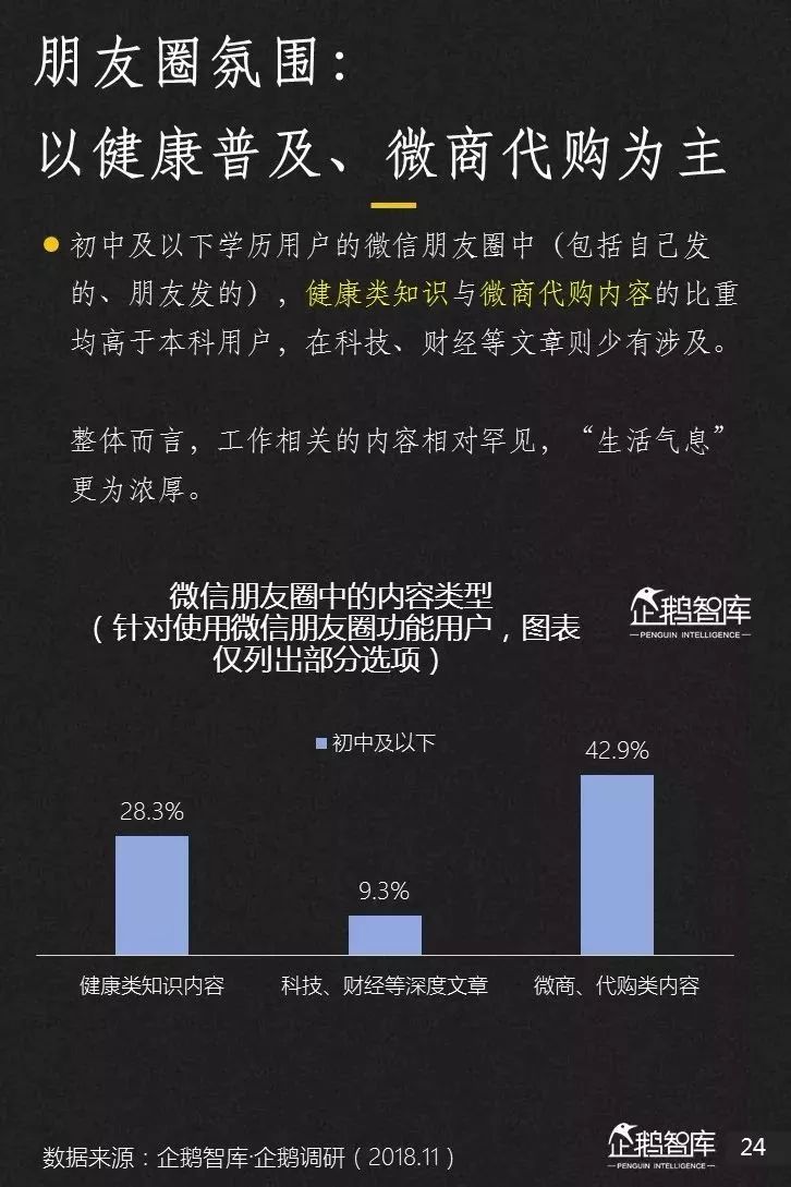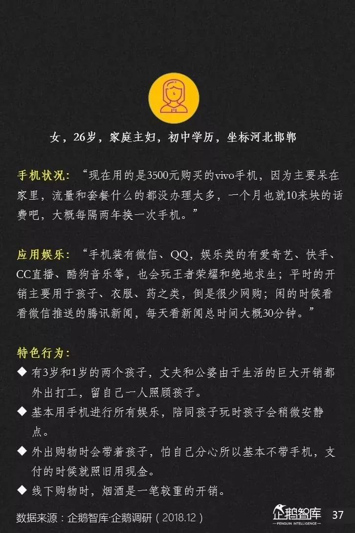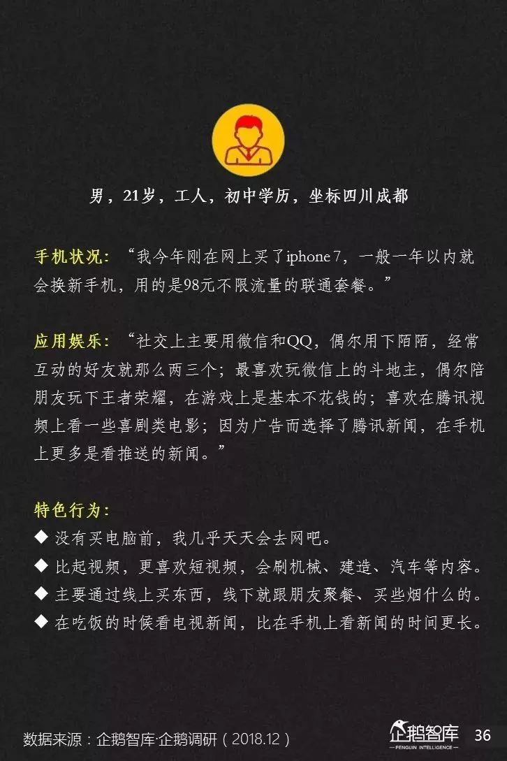 4、庞大的初中及以下学历网民,对手机很依赖。互联网不仅为他们提供娱乐,还影响着他们的消费和认知;