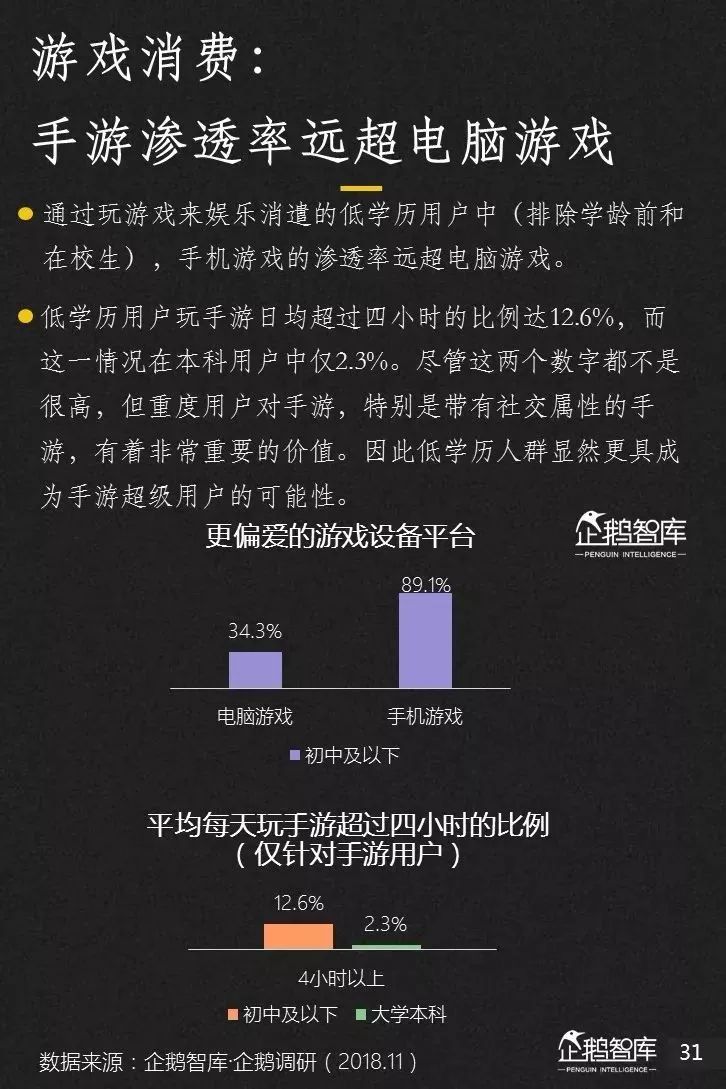 值得注意的是,尽管对游戏的整体偏爱度,低学历用户略低与高学历,但游戏的重度用户占比方面,低学历游戏人群是高学历的5倍。