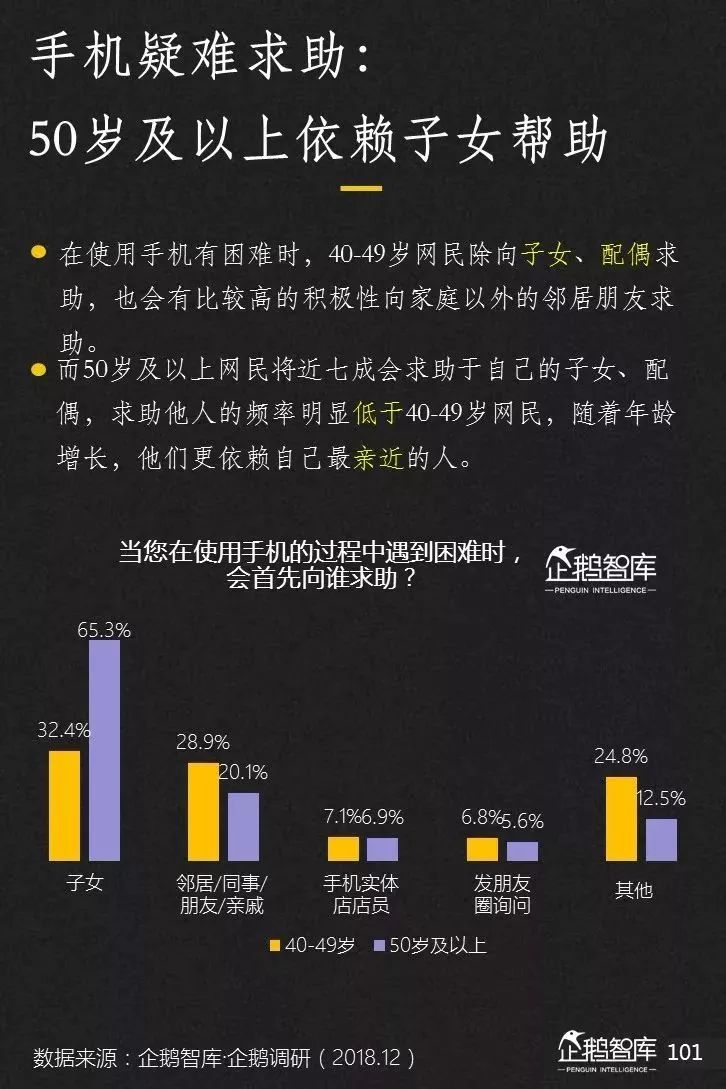 50岁以上网民对手写输入法依赖度很高,当使用手机遇到困难时,子女是他们最主要的求助对象。
