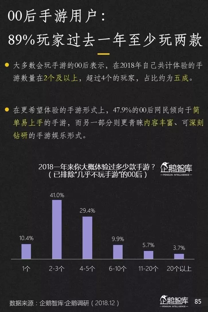 还有游戏。00后 的游戏玩家中,90%过去一年至少体验过两款手游。体验过四款及更多的玩家,占比接近50%。