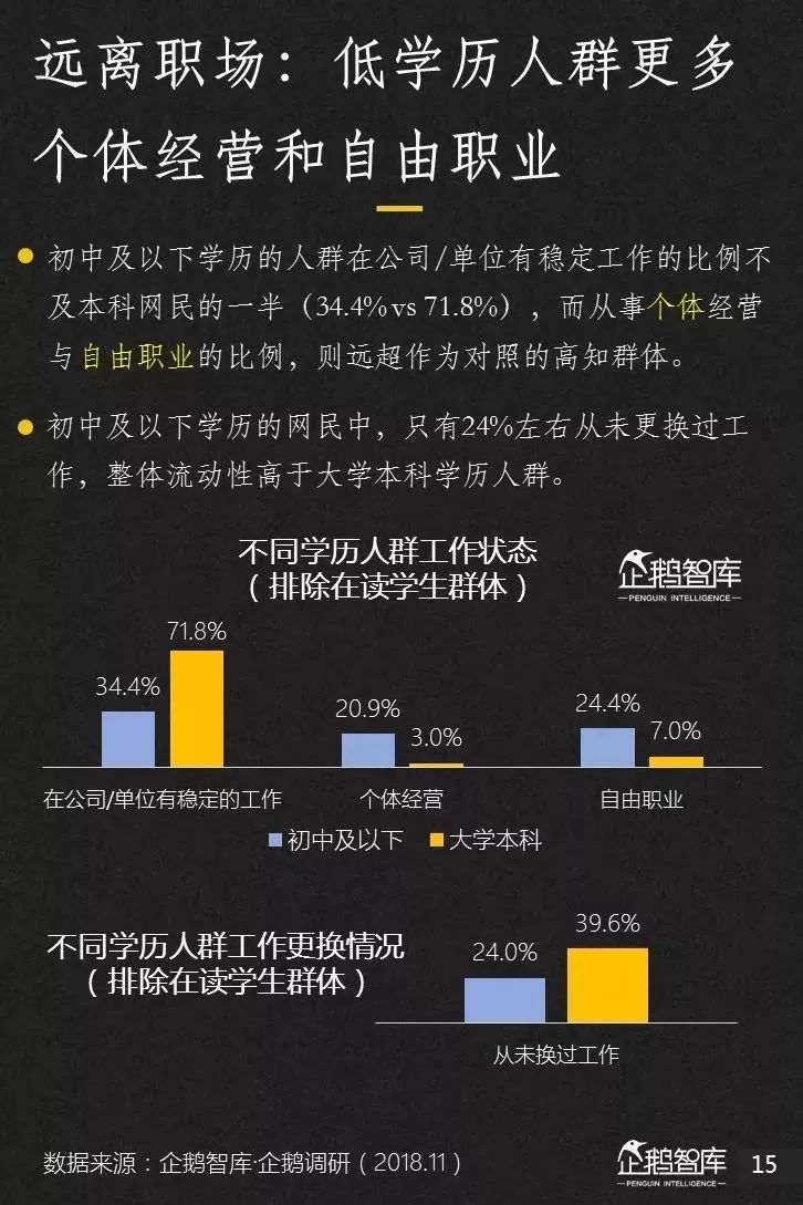 在互联网之外,我们同样关切他们的基础属性。相对比高学历人群,初中以下学历网民,从事个体经营和自由职业的比例非常高,这意味更大的时间自主性,和更高的非职场社交和信息需求。
