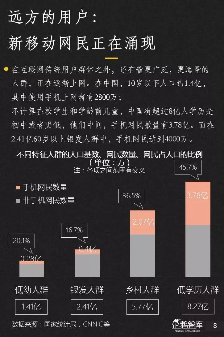我们再压低一些,如果我们只看10岁以下的中国人,那也有1.41亿,其中,有2800万人使用手机在上网。