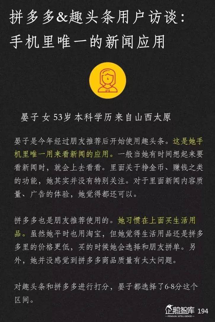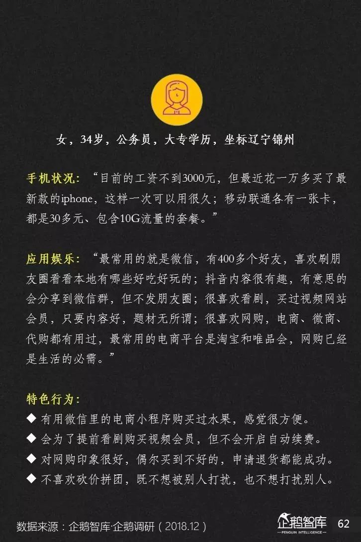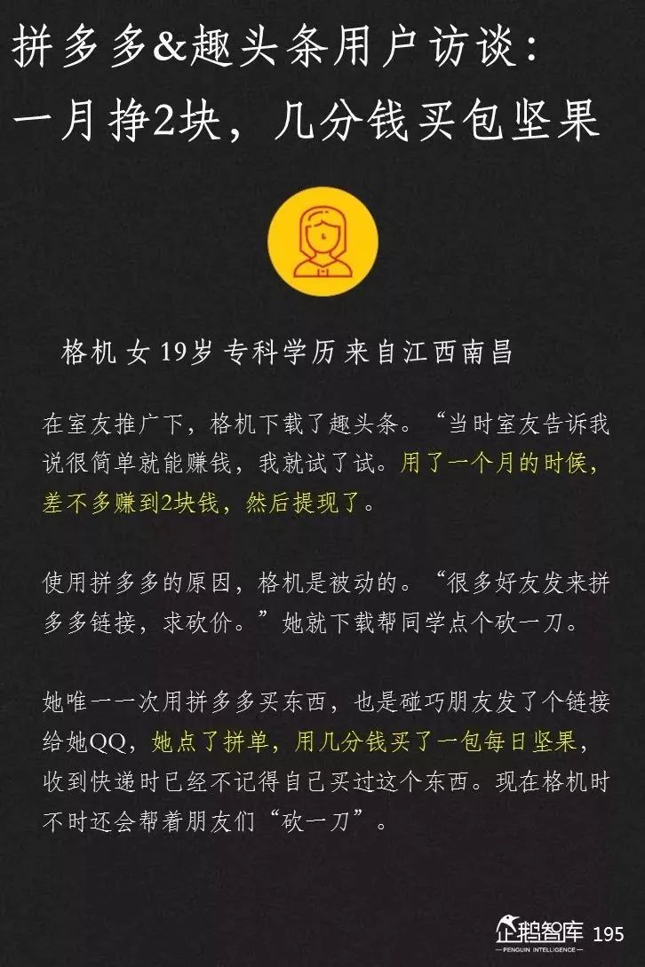 对互联网产品尚未形成使用习惯和偏好;过去更多在线下进行消费,使用智能手机和互联网时间并不长;对价格敏感,对质量,品牌和设计重视度相对较低;有更充足的时间,并愿意消耗它们来换取微小的报酬;有压力更低的社交圈层,以亲属邻居为主,可以接受“打扰式”的传播分发。