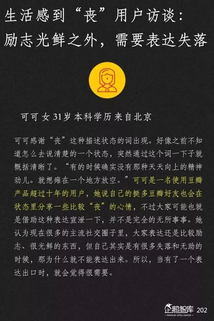 我们讨论丧,更期待是有更多的产品和服务,可以给小确丧”的网民,特别是年轻网民,一些缓解和治愈。无论是社交类产品,娱乐类产品,还是学习类产品。